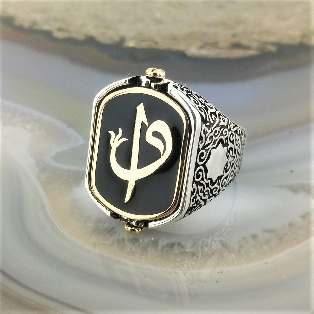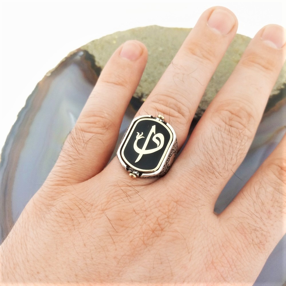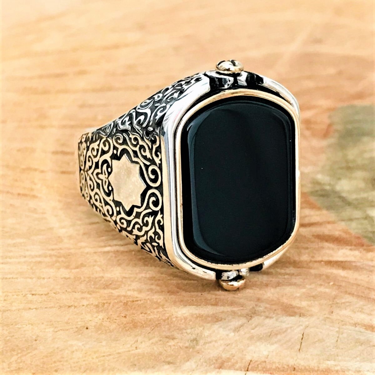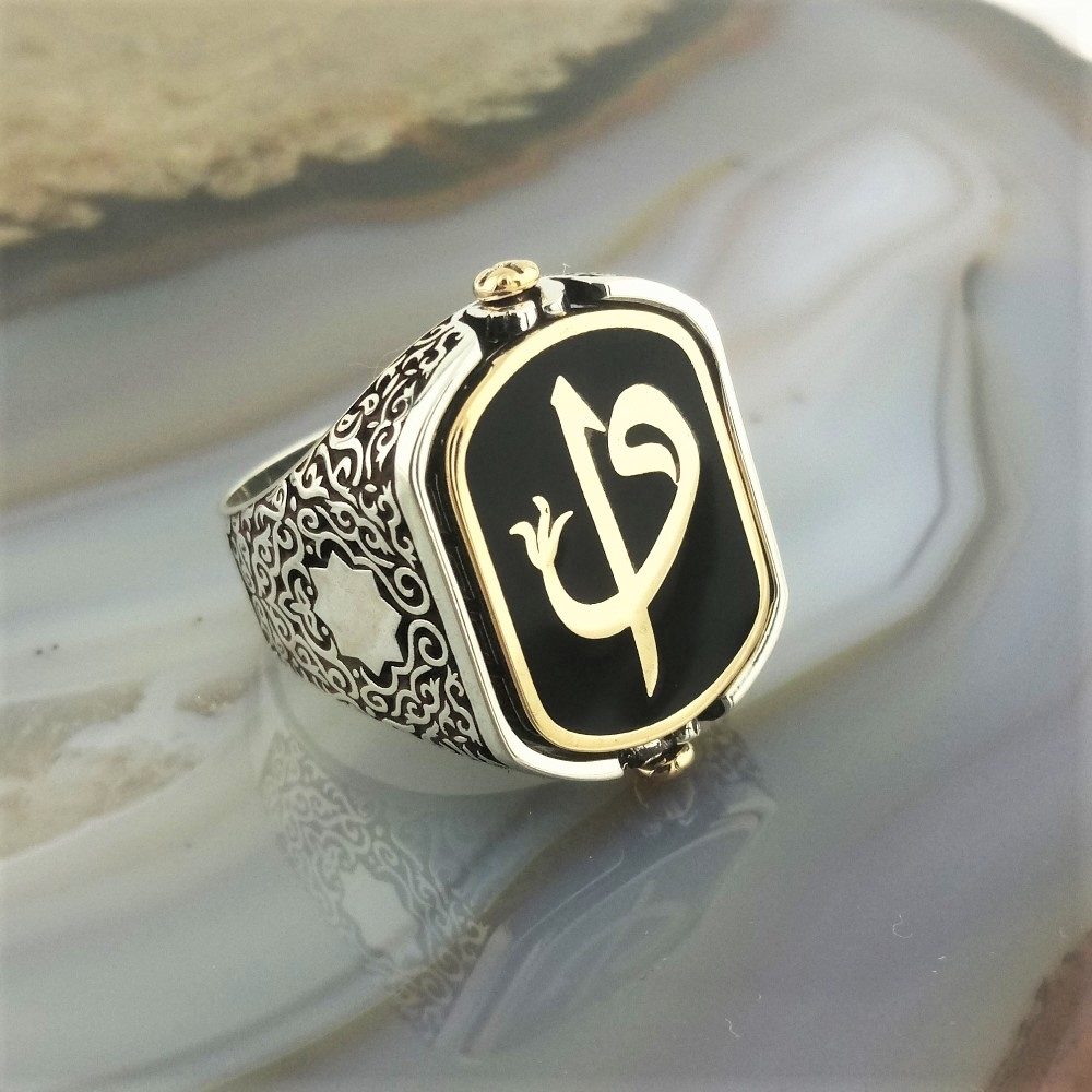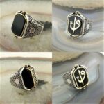 Çift Taraflı Elif Vav İşlemeli Siyah Taşlı Erkek Gümüş Yüzük MY102434