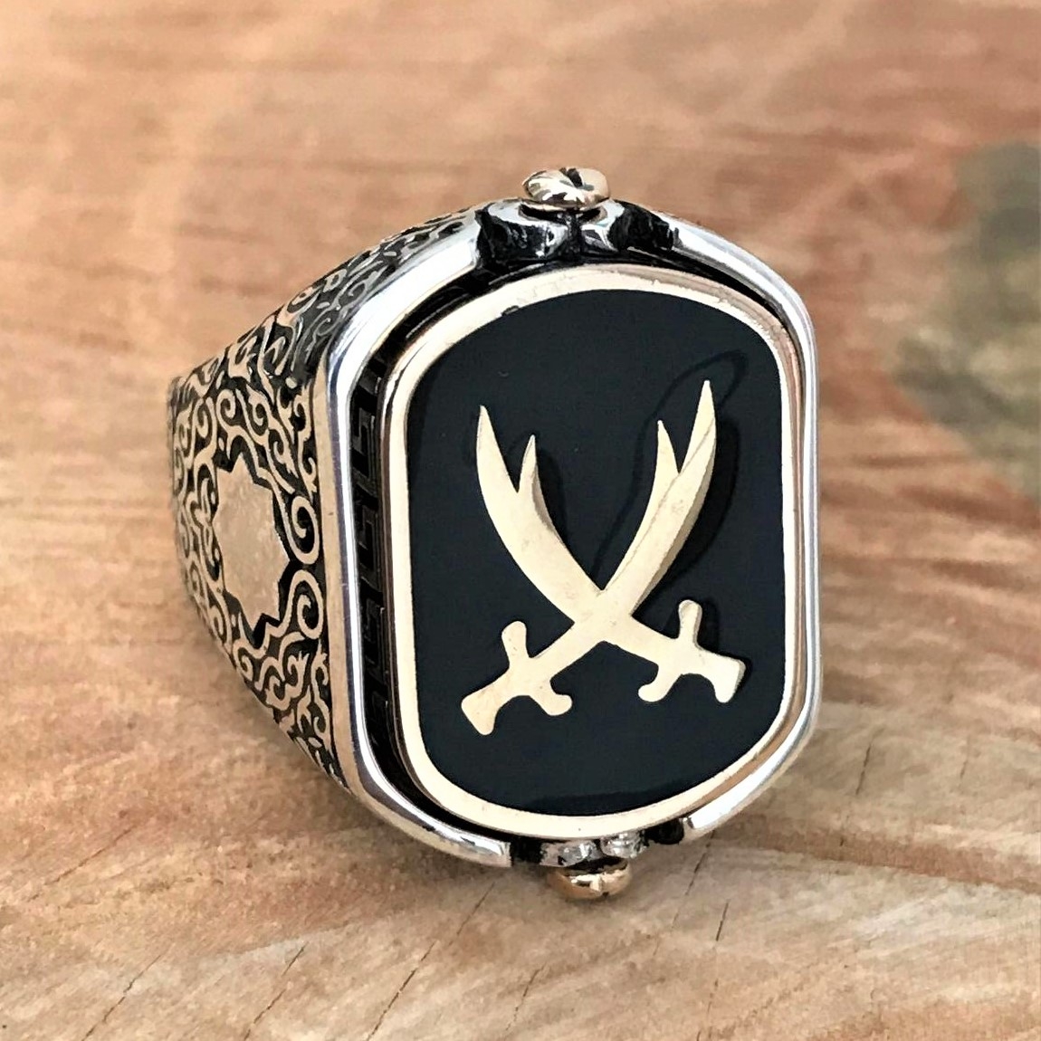 Çift Taraflı Zülfikar İşlemeli Siyah Taşlı Erkek Gümüş Yüzük MY102304