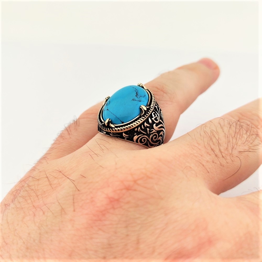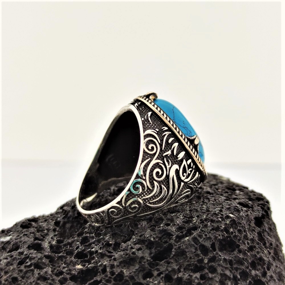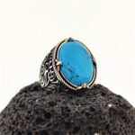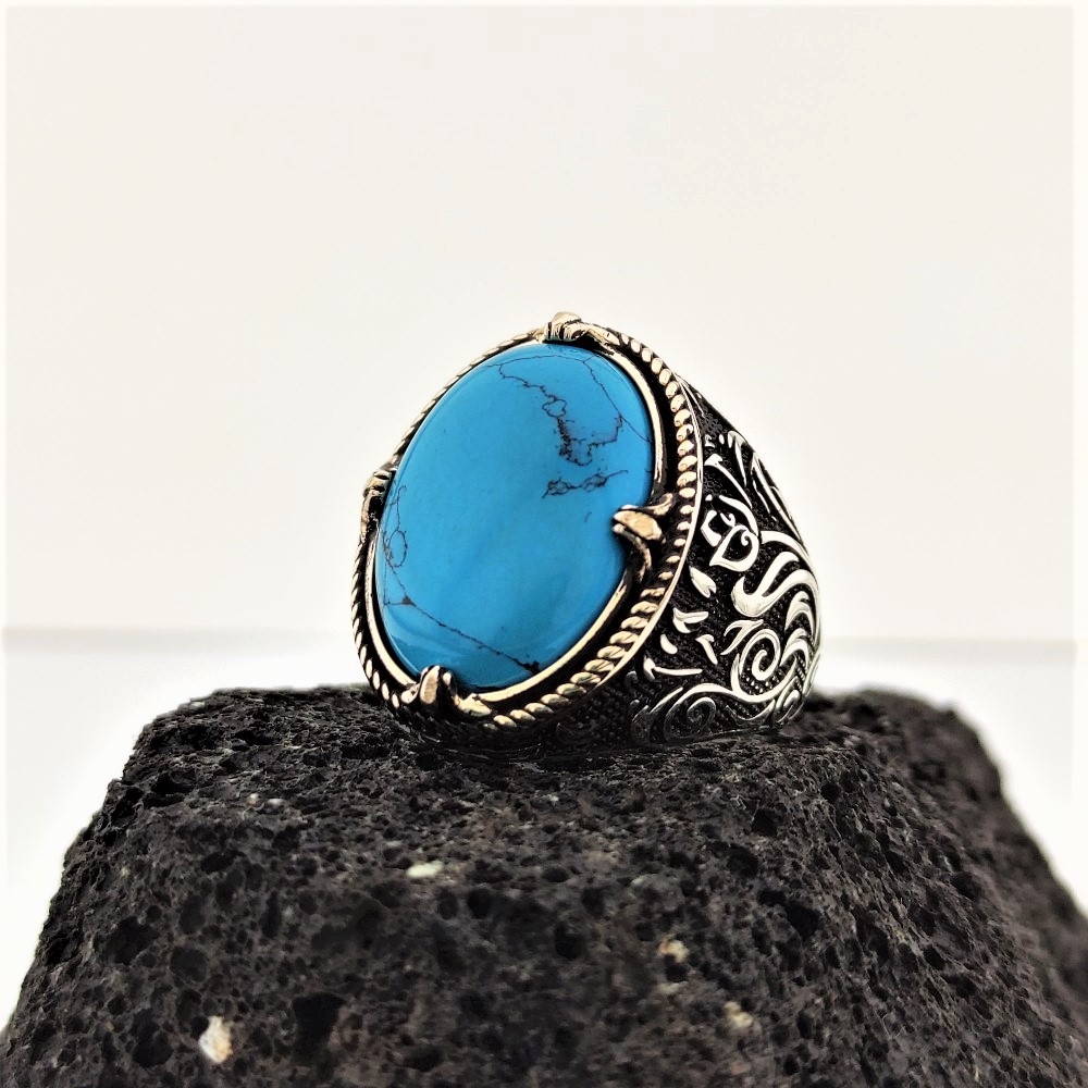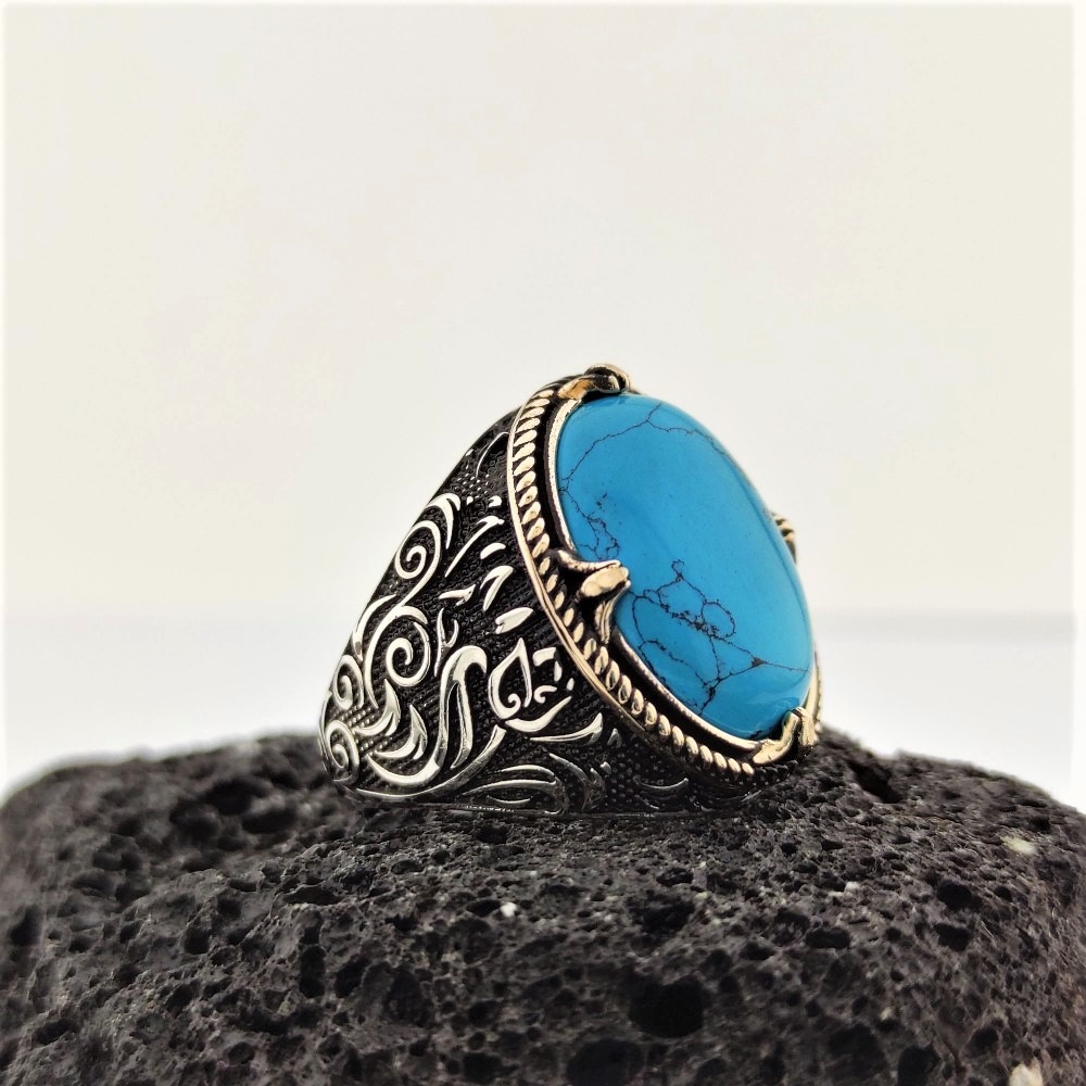 Firuze Taşlı Lale Motifli Erkek Gümüş Yüzük MY102527