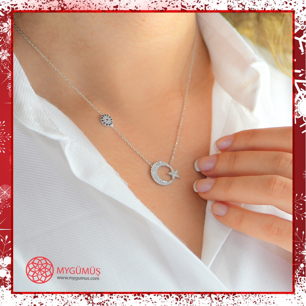 Taşlı Göz Boncuklu Ay Yıldız Gümüş Kolye MY101140